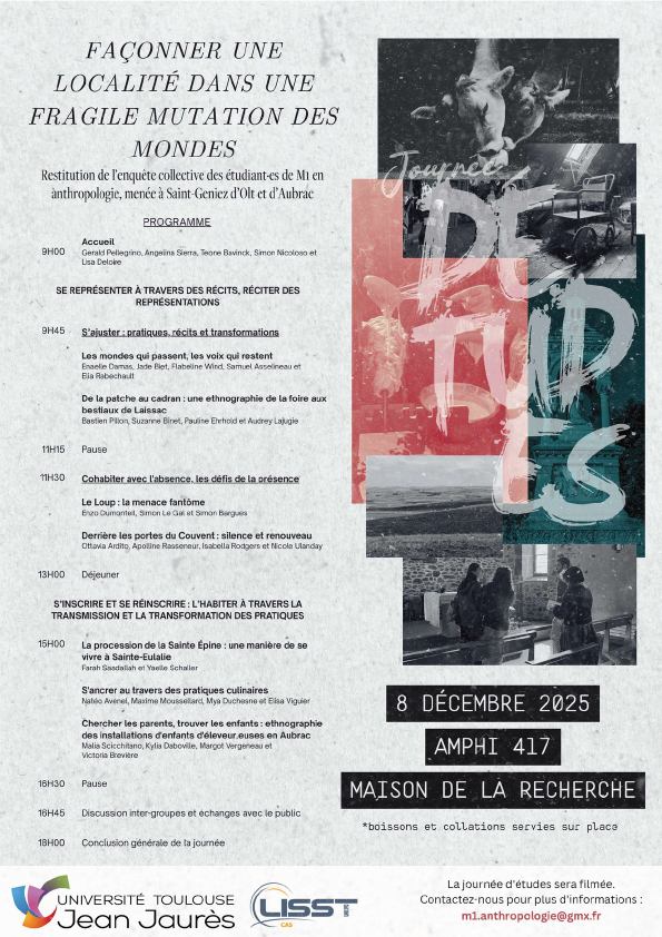 Maison de la Recherche - Amphi 417 La promotion de Master 1 d'Anthropologie de l'université Toulouse Jean Jaurès est heureuse de vous inviter à participer à sa journée d'études
