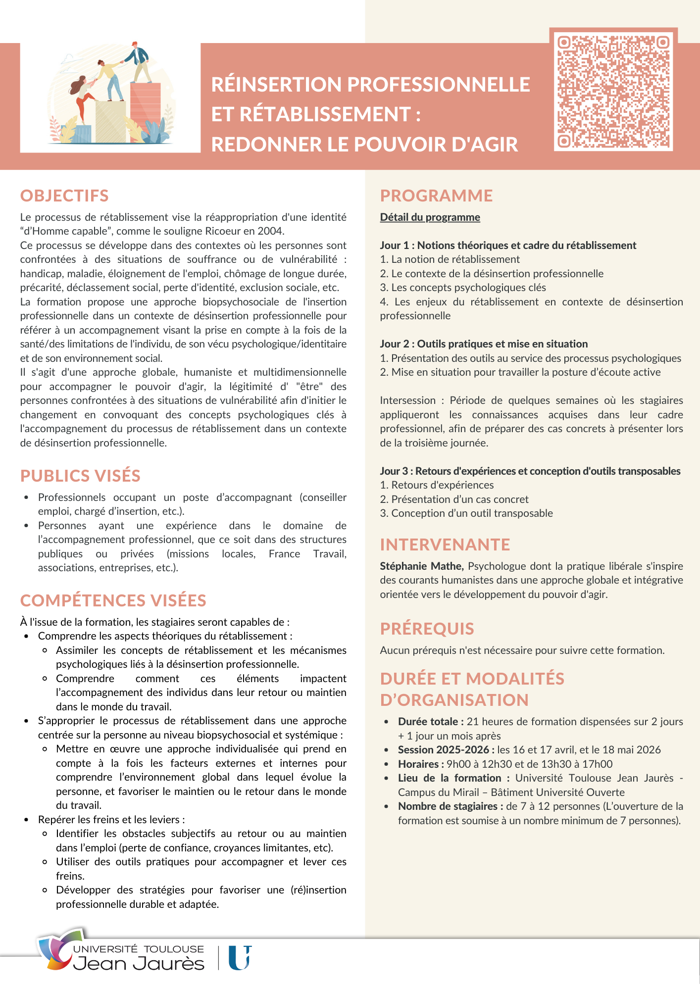 - Développer des stratégies pour favoriser une (ré)insertion professionnelle durable et adaptée.