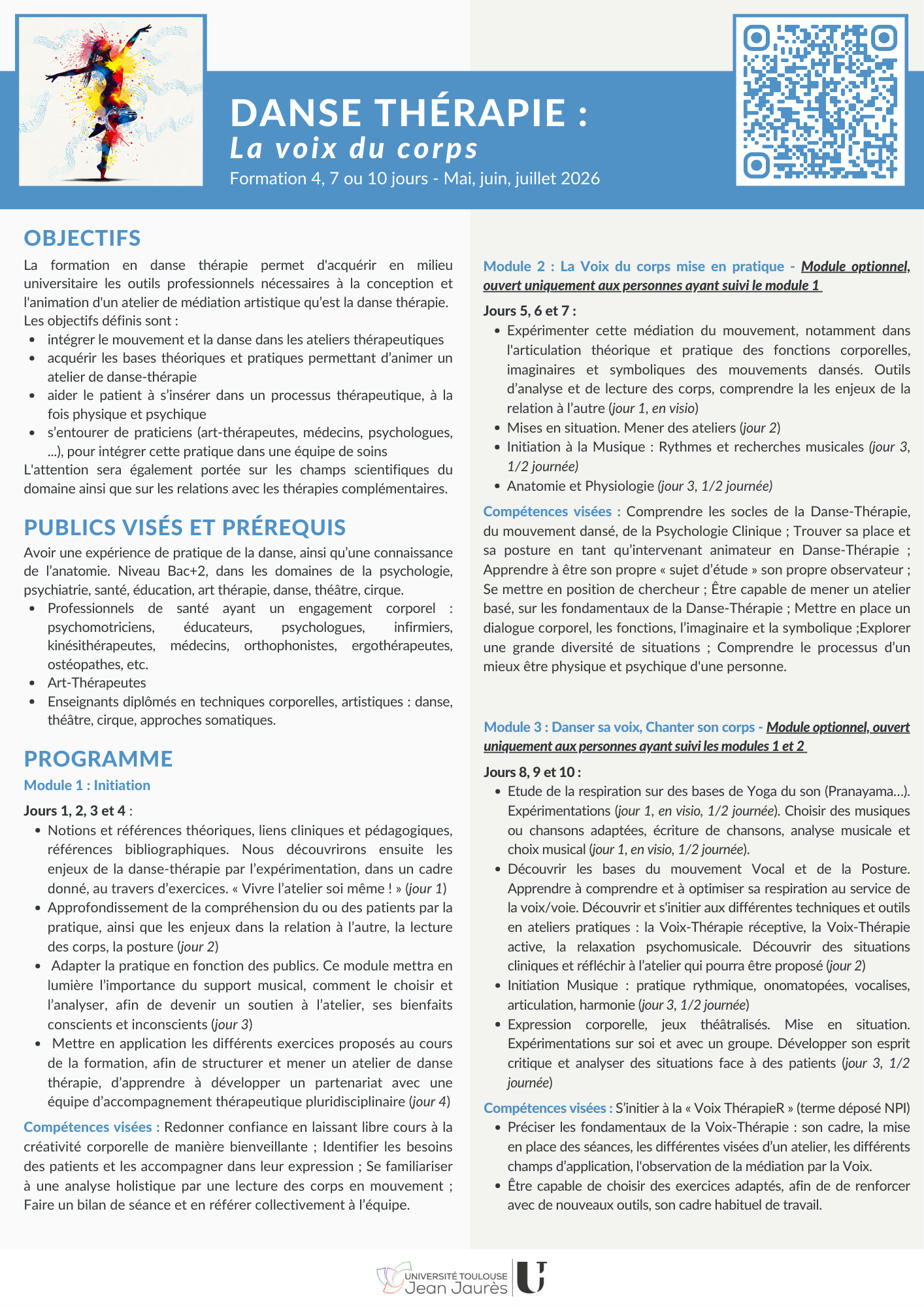 La formation en danse thérapie permet d'acquérir en milieu universitaire les outils professionnels nécessaires à la conception et l'animation d'un atelier de médiation artistique qu’est la danse thérapie.