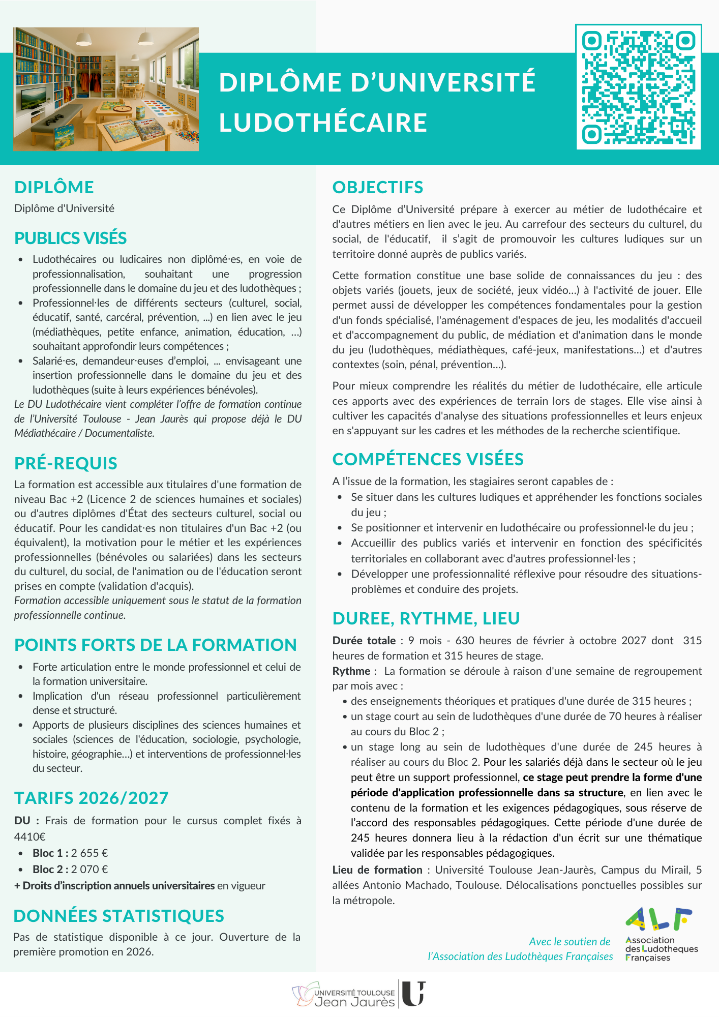 - Ludothécaires ou ludicaires non diplômé⋅es, en voie de professionnalisation, souhaitant une progression professionnelle dans le domaine du jeu et des ludothèques ;