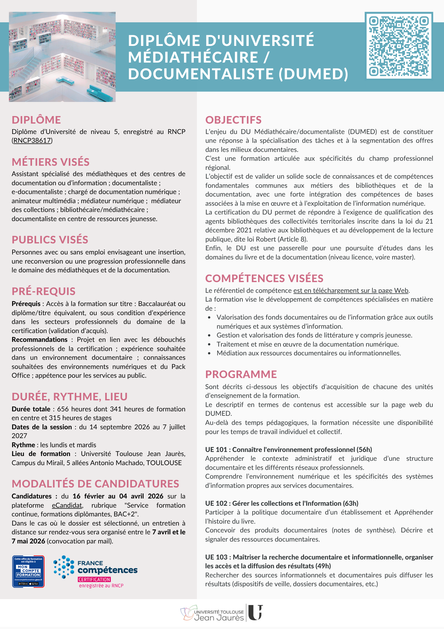 - d’acquérir, compléter ou actualiser les connaissances, les techniques et les compétences professionnelles de base propres aux métiers des médiathèques et de la documentation ;