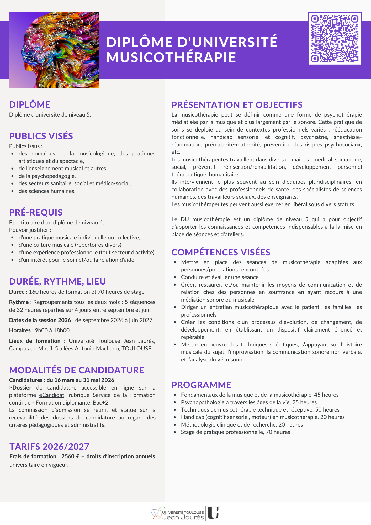 La prochaine session de formation se déroulera entre septembre 2026 et juin 2027.Dossier de candidature téléchargeable en ligne via l’outil eCandidat rubrique Service Formation continue - Formations diplômantes, Bac +2 : Candidatures du 16 mars au 31 mai 2026.