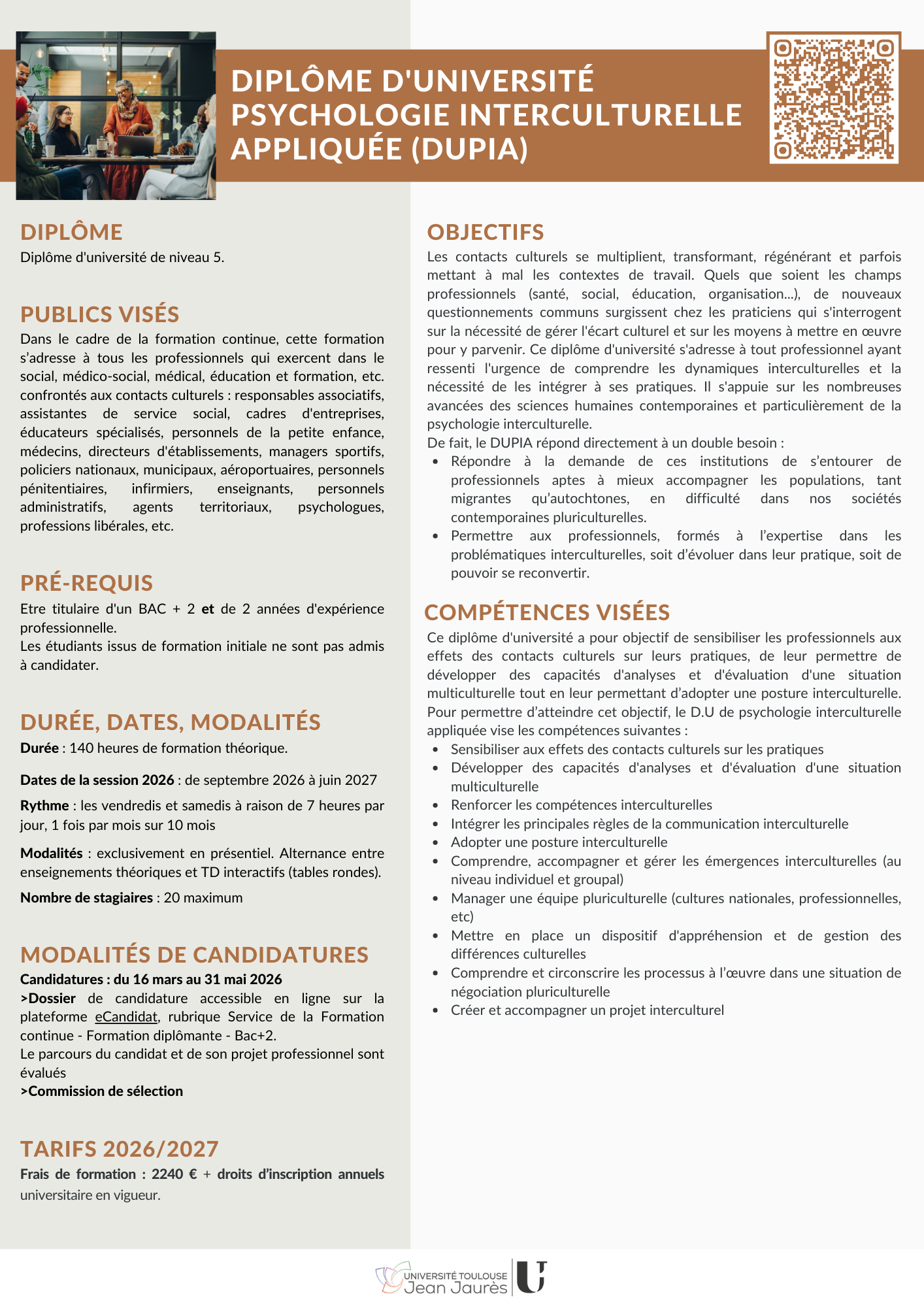 Au travers d'enseignements théoriques adaptés et de TD interactifs, l'équipe des intervenants coordonnée par Zohra Guerraoui, Maître de conférences en psychologie interculturelle, vous propose de développer les compétences suivantes: