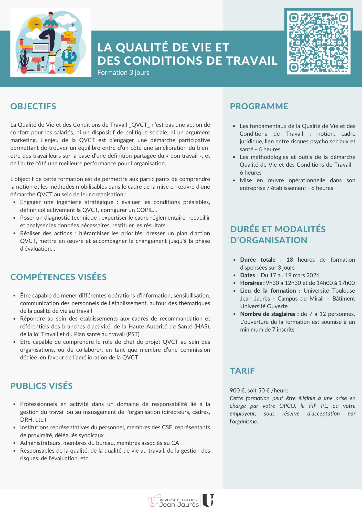 Les intervenants sont également responsables du Diplôme Universitaire Conduire une démarche qualité de vie au travail , dispensé depuis 2017 à l’Université Toulouse Jean-Jaurès, enregistré au répertoire spécifique RS6068.