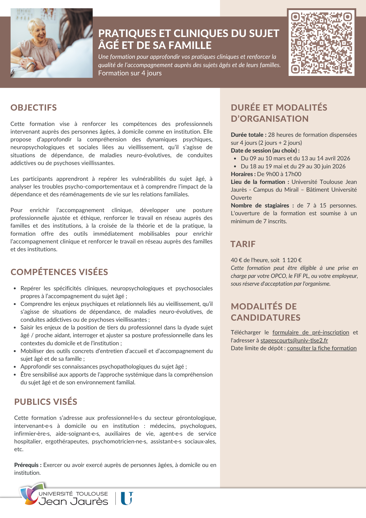 Prérequis : Exercer ou avoir exercé auprès de personnes âgées, à domicile ou en institution.