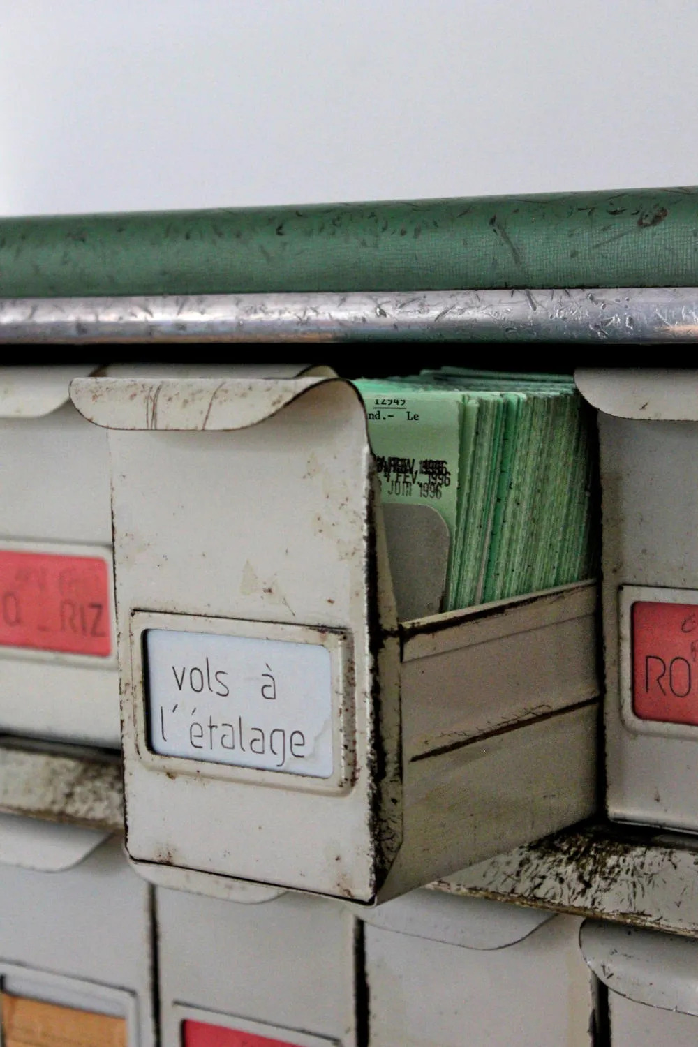 Pour CAMISOLE DE FRANCE, à La Fabrique, Étienne Cliquet présente deux meubles à fiches ayant appartenu à la police et plusieurs séries de fiches en rapport avec la surveillance depuis les fiches perforées jusqu’aux smartphones, des années 30 à aujourd’hui.