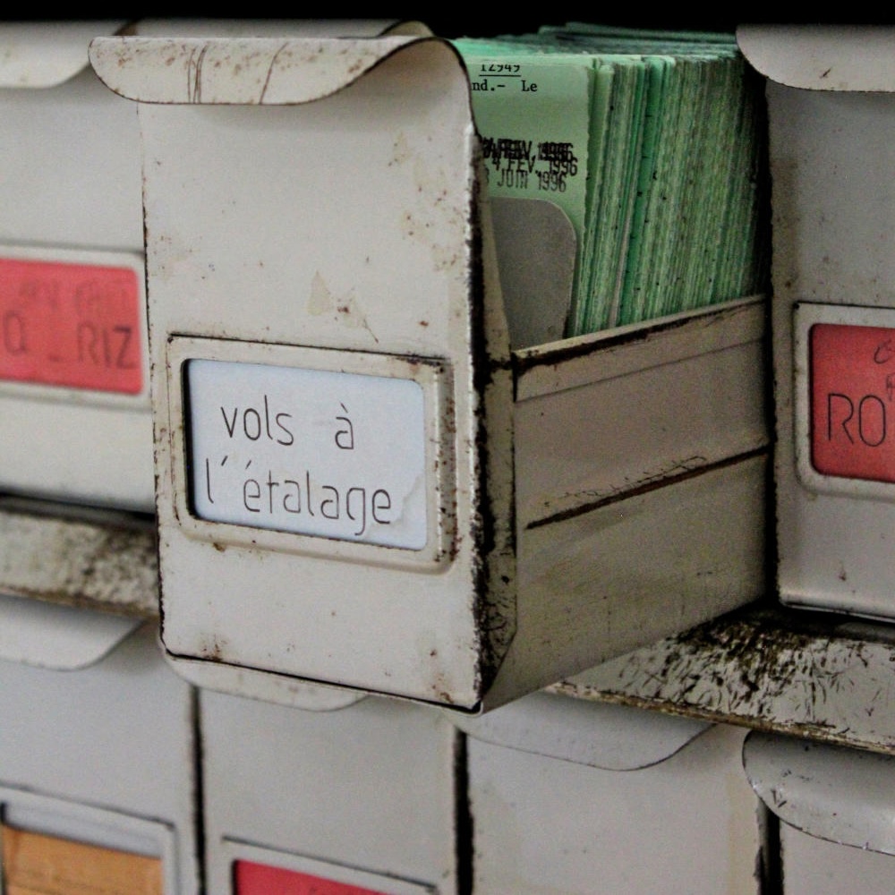 Pour Camisole de France, à La Fabrique, Étienne Cliquet présente deux meubles à fiches ayant appartenu à la police et plusieurs séries de fiches en rapport avec la surveillance depuis les fiches perforées jusqu’aux smartphones, des années 30 à aujourd’hui.